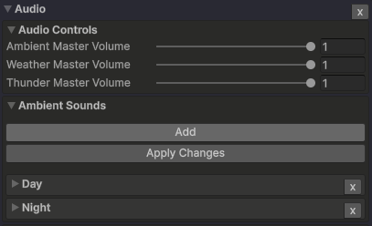 Add按钮添加一个新的音效。请确保设置唯一的名称,以便能够在天气类型中选择它们。 Apply Changes按钮将为所有音效重新创建音频源。