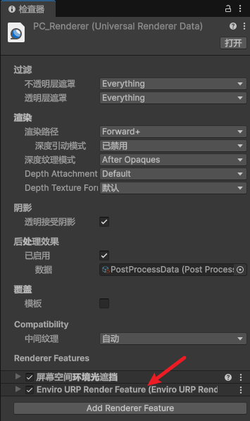 Depth Texture深度纹理选项,然后打开分配的 URP 渲染器。) - [5、将 `Enviro URP Render Feature` 添加到您的渲染器中。](#5、将