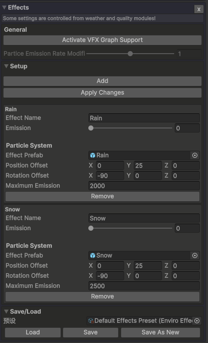 特效模块为 Enviro 添加了粒子特效支持。使用预定义的发射滑块控制它们的发射率。如果添加了天气模块,这些将由天气模块控制。