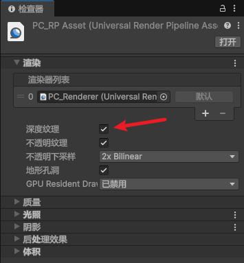 4、启用 Depth Texture深度纹理 选项,然后打开分配的 URP 渲染器。