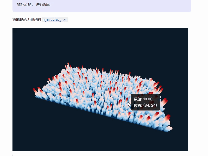 Prop:类型 说明。data:number[][]热力图数据。width/height:number容器尺寸。baseSize:number柱体底面尺寸。maxHeight:number柱体最大高度。rotateAnimation:boolean是否开启自动旋转。rotationSpeed:number旋转速度。isStandardColor:boolean是否使用十段渐变色。rotateAnimation:Boolean是否启用旋转动画cameraPosition:控制three3D中的相机视角。