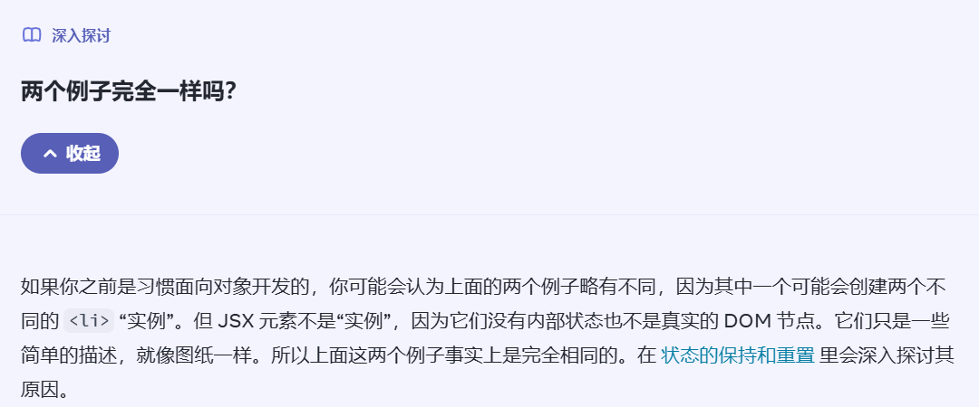 React 只关心这张 "图纸" 的结构,而不关心你是用哪种语法生成的它。因此,从 JSX 的本质和 React 的渲染逻辑来看,这两个例子在功能和最终效果上完全相同。