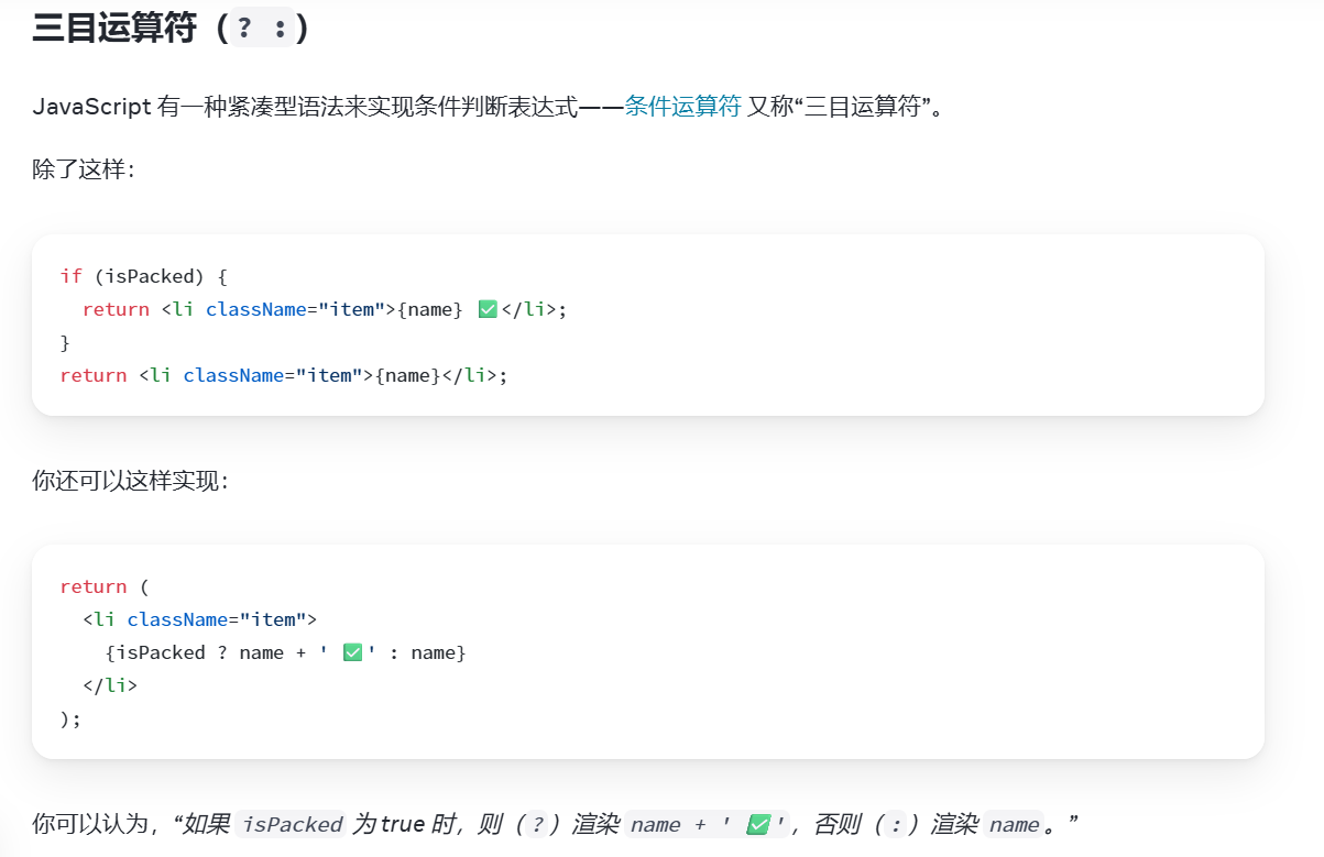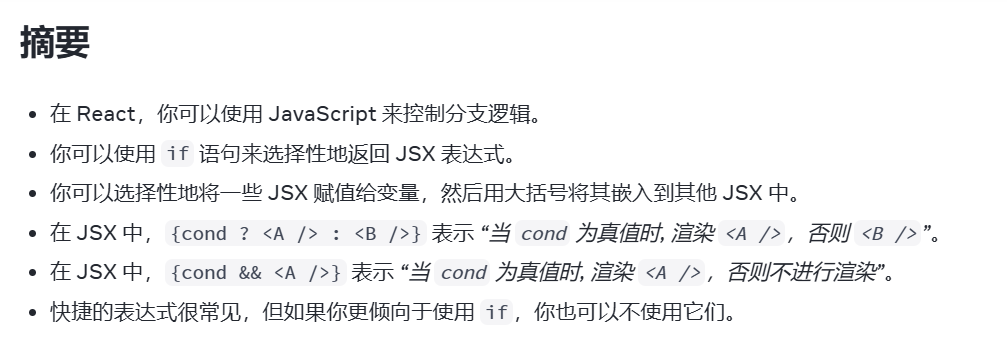 虽然三元运算符、逻辑与这些快捷表达式在 React 开发中很常见,但如果你觉得if语句更易读、更符合自己的编码习惯,完全可以选择用if来实现分支逻辑,React 对这几种方式没有优劣限制,以代码可读性和维护性为准即可。