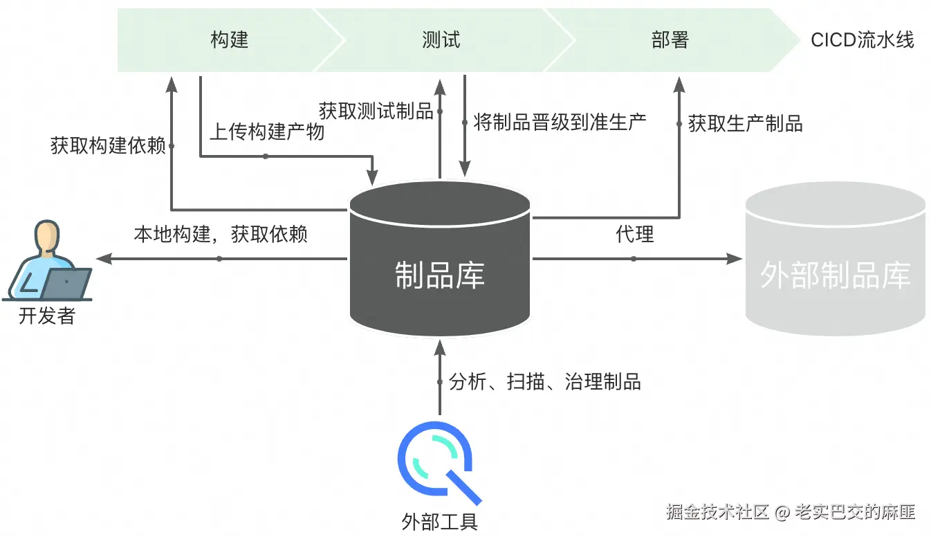 制品仓库作为开发、测试、安全、运维人员的桥梁,连接整个 CI/CD 工作流。