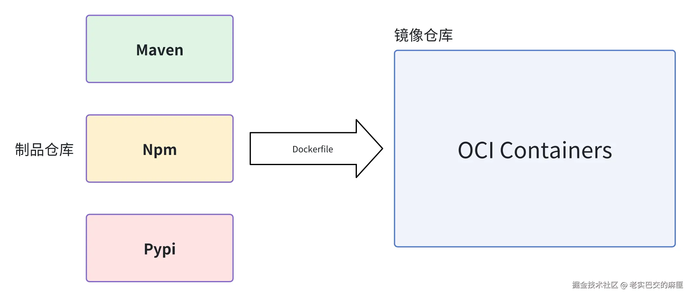 制品仓库托管特定类型的产出制品如 Maven、Npm、Pypi,而容器镜像则是云原生时代通用制品 。简单来说,容器镜像是对制品的再封装,CD 的部署单元被统一为 OCI 镜像 ,生产环境中的节点是完全对等的、环境依赖无关的,容器服务可以像云一样在计算平面上自由飘移。因此,云原生技术架构下,CD 流水线通常只面向镜像仓库。