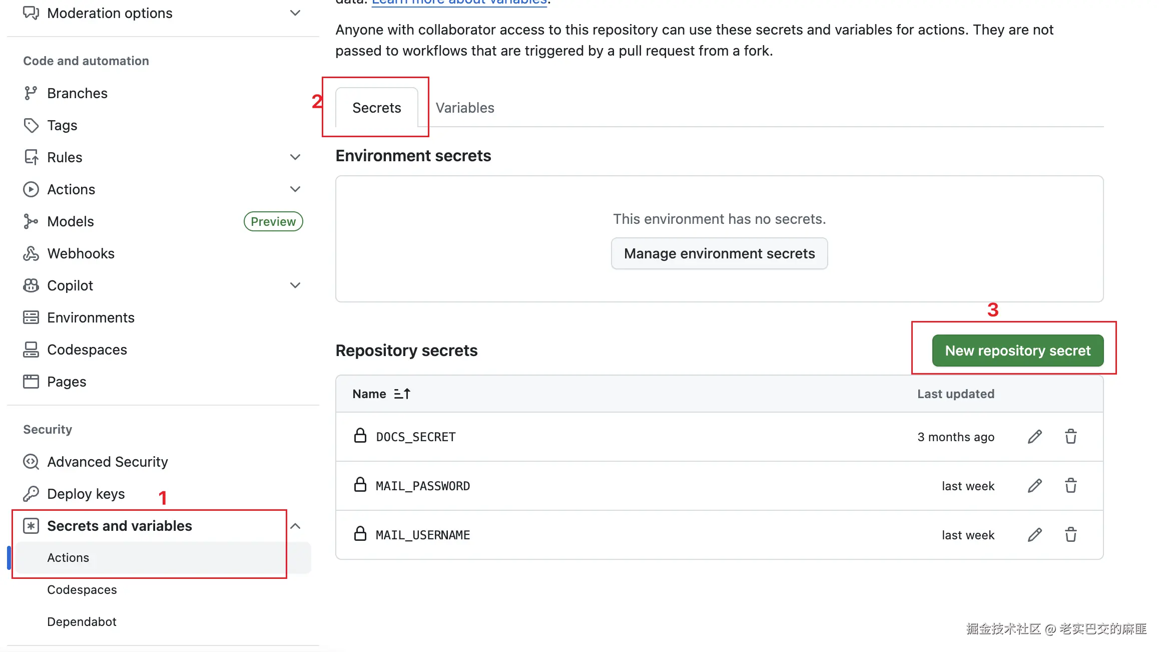 在仓库中设置上述密钥变量,${项目仓库} -> Settings -> Secrets and variables -> Actions