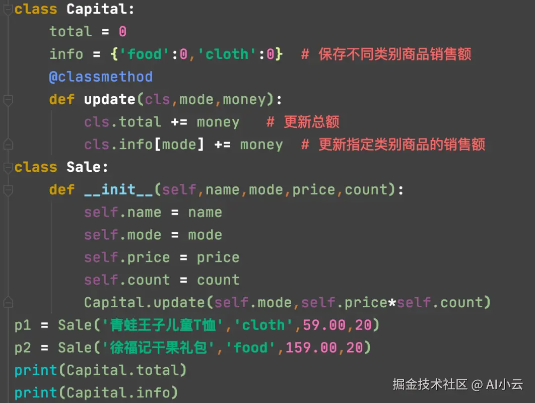 - 声明一个资金类,有3个类属性,分别保存销售总额,食品类销售额、服饰类销售额;声明一个类方法用于更新销售总额、以及不同商品类别的销售额