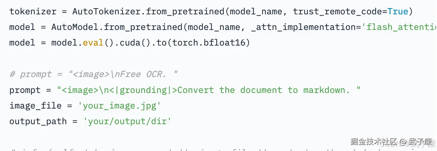 在使用DeepSeek-OCR时,输入通常是一张图片(例如文档扫描页),模型会将其编码为一串内部视觉token,并由解码器生成相应的文字。为了让模型知道何时接收图像,DeepSeek-OCR约定了特殊的输入格式:在文本Prompt中使用特殊标记占位,然后传入实际图像张量。