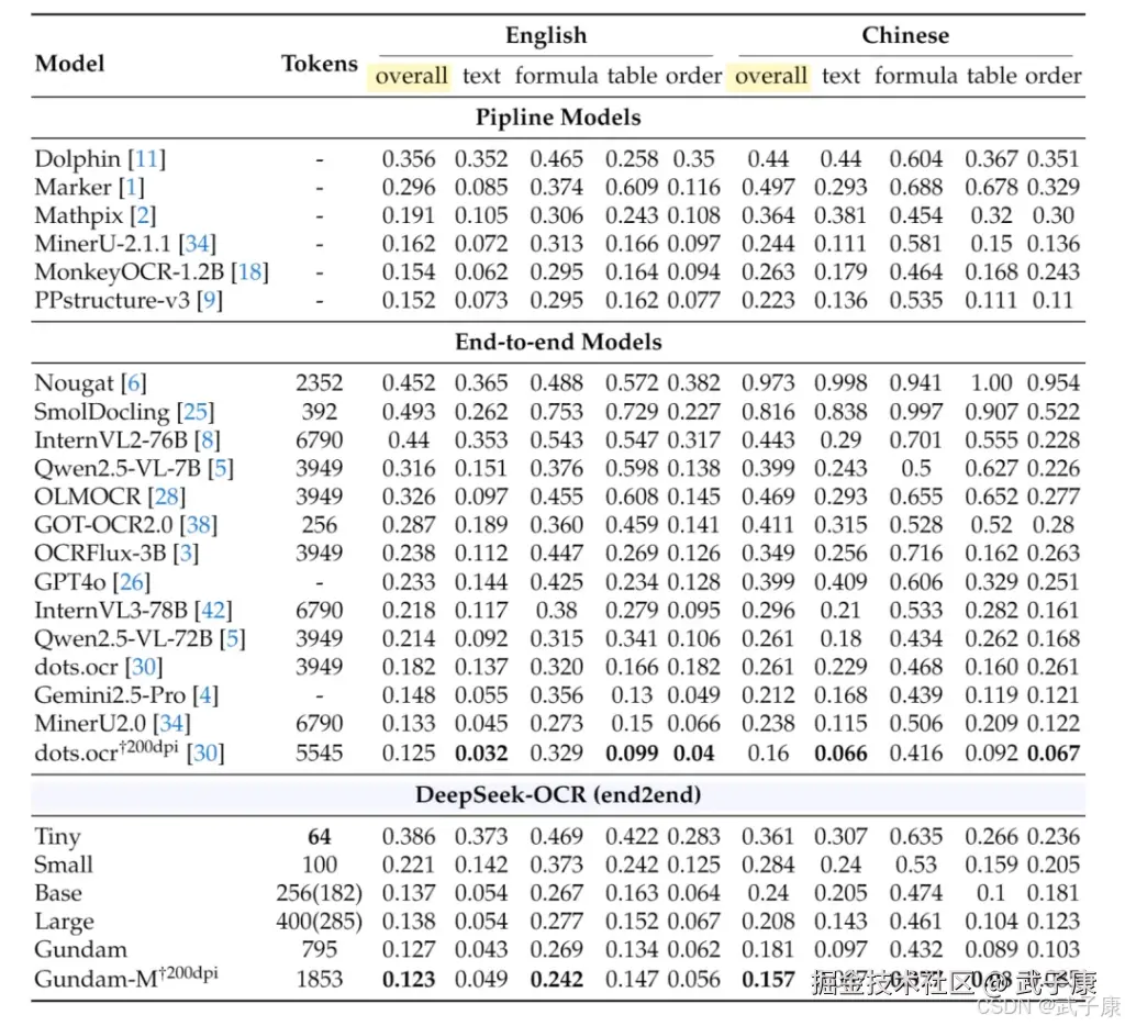 这样既在参数规模上扩展了模型容量,又控制了推理开销(每步只用一小部分专家)。DeepSeek-3B-MoE的职责是将来自DeepEncoder的压缩视觉token翻译回自然语言。由于其在训练中见过海量的文档数据,它不仅能输出纯文本,还可以在需要时输出结构标记(例如检测坐标、表格结构等)。