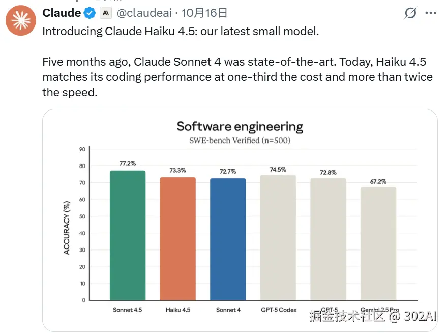 距 Claude Sonnet 4 问鼎业界编程翘楚五个月后,Anthropic 再度官宣发布其 Claude 家族轻量级新作------Claude Haiku 4.5,并宣称该模型在编码性能上已媲美 Sonnet 4,而价格仅为后者的三分之一,速度更是提升一倍以上,堪称一款极具竞争力的 Sonnet 4 平替。