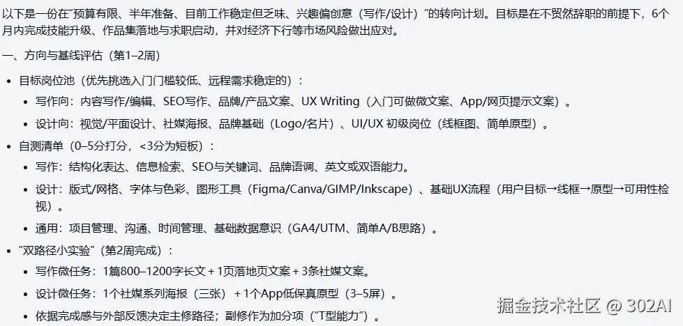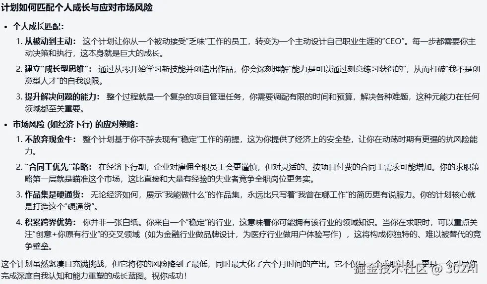 输出了清晰的分阶段计划,但是在风险分析中仅提到经济下行、AI替代,未提及家庭因素或中年转向。