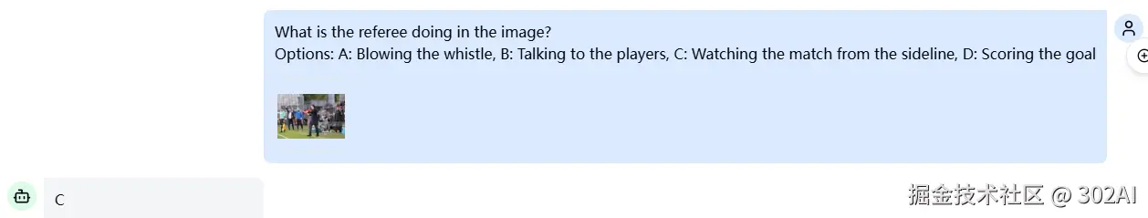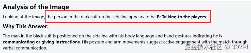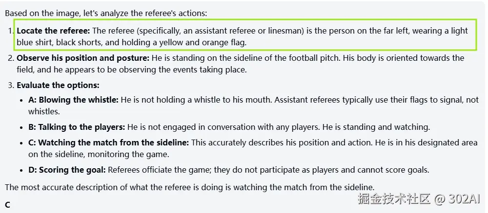 模型只识别了画面中的主体人物(身着黑西装男子),并根据其肢体动作误选了B。实际上画面左侧手持黄旗的人物才是裁判。