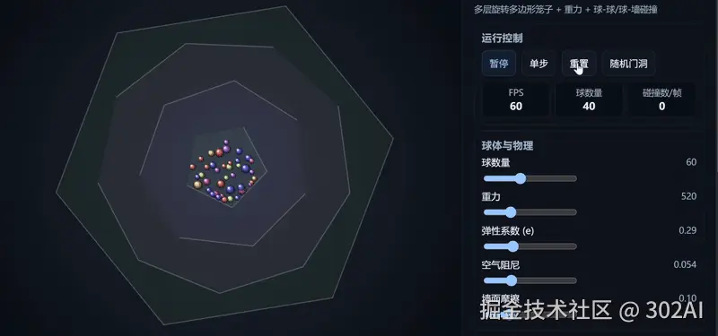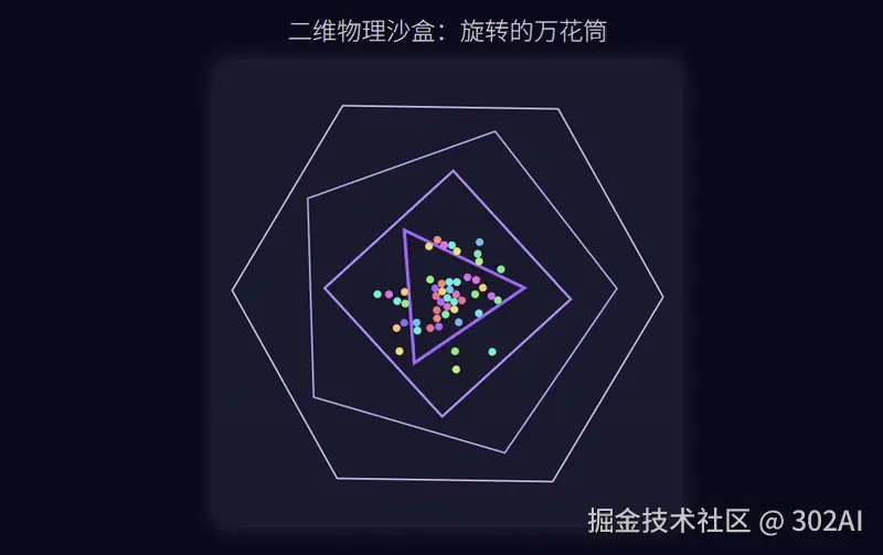 案例: 想象一个二维世界,像是一个复杂的万花筒。在这个世界里,有多个层层嵌套的多边形"笼子"。这些笼子以不同的速度和方向持续旋转。在最内层的笼子里,有许多小球。这些小球受到重力、与笼子壁的碰撞以及彼此之间的碰撞影响,在旋转的迷宫中穿行。