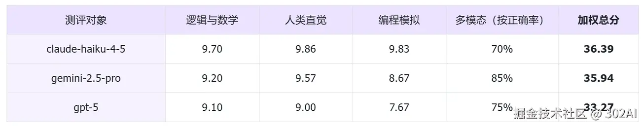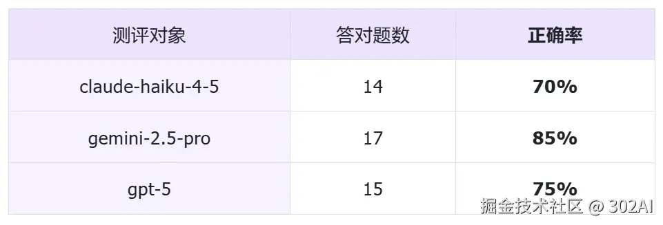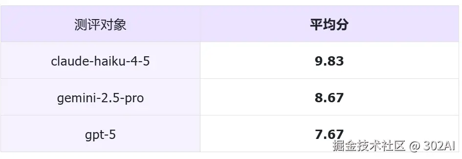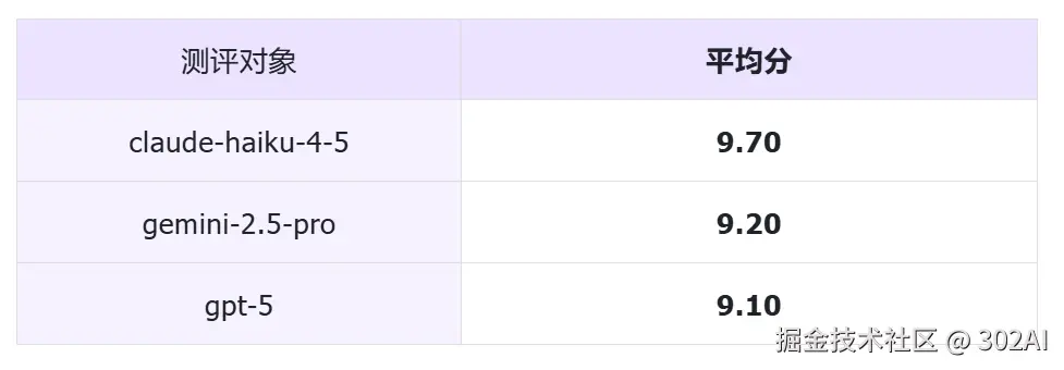 302.AI 也已第一时间接入了 Claude Haiku 4.5 模型 API,本期评测将使用 Gemini 2.5 Pro 及 GPT-5 这两款顶尖模型,与 Haiku 4.5 展开多维度实测,清晰呈现其性能定位与竞争优势。