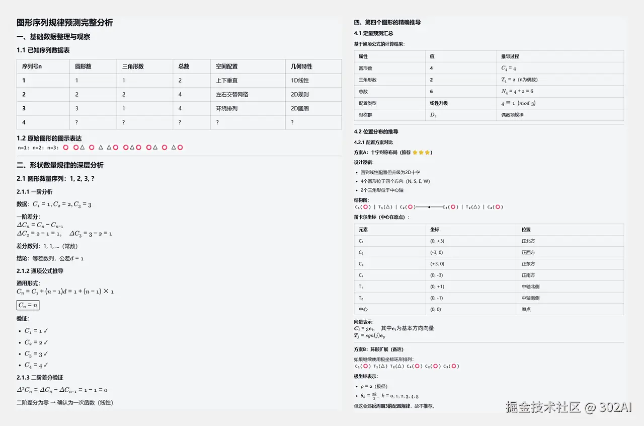 案例:观察以下图形序列:第一个图形有1个圆形在上方和1个三角形在下方;第二个有2个圆形在左侧和2个三角形在右侧,位置交替;第三个有3个圆形环绕1个三角形。请预测第四个图形的精确组成,包括形状数量、位置分布,并用数学公式(如n阶序列)证明规律(必须解释递增模式和位置变换逻辑)。