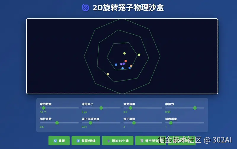 Gemini 2.5 Pro :运动轨迹平滑,整体视觉更直观,但部分小球运动不符合物理规律,且未额外生成模拟器操作台。