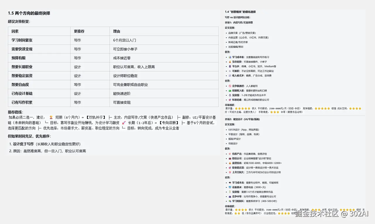 提供详细步骤,包括技能评估、学习路径、作品集构建、求职策略等。然而兴趣量化较浅,仅通过"双路径小实验"测试,未使用问卷或矩阵进行深度量化。