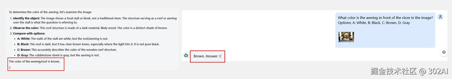 不过,Haiku 4.5 在细粒度感知题型中达到了全部正确,例如以下要求识别建筑遮阳棚颜色的实测中,只有 Haiku 4.5 正确将其识别为黑色,另外两组模型均错误识别为棕色。