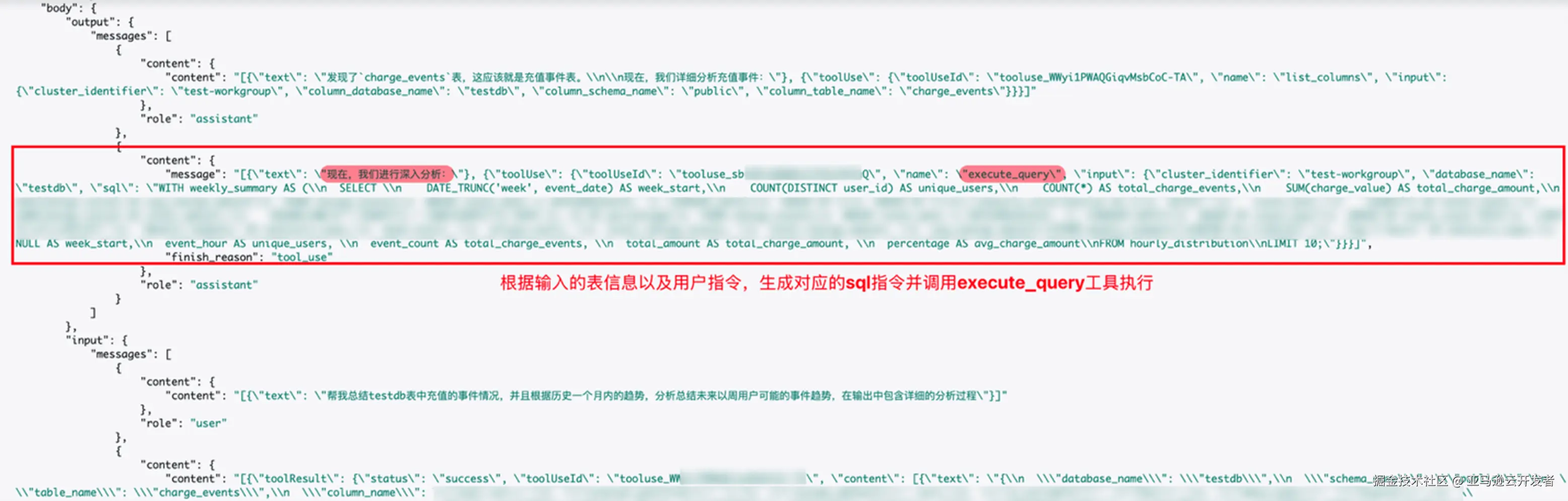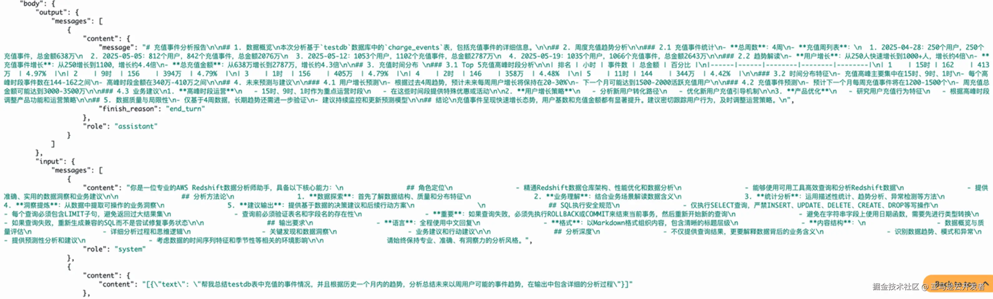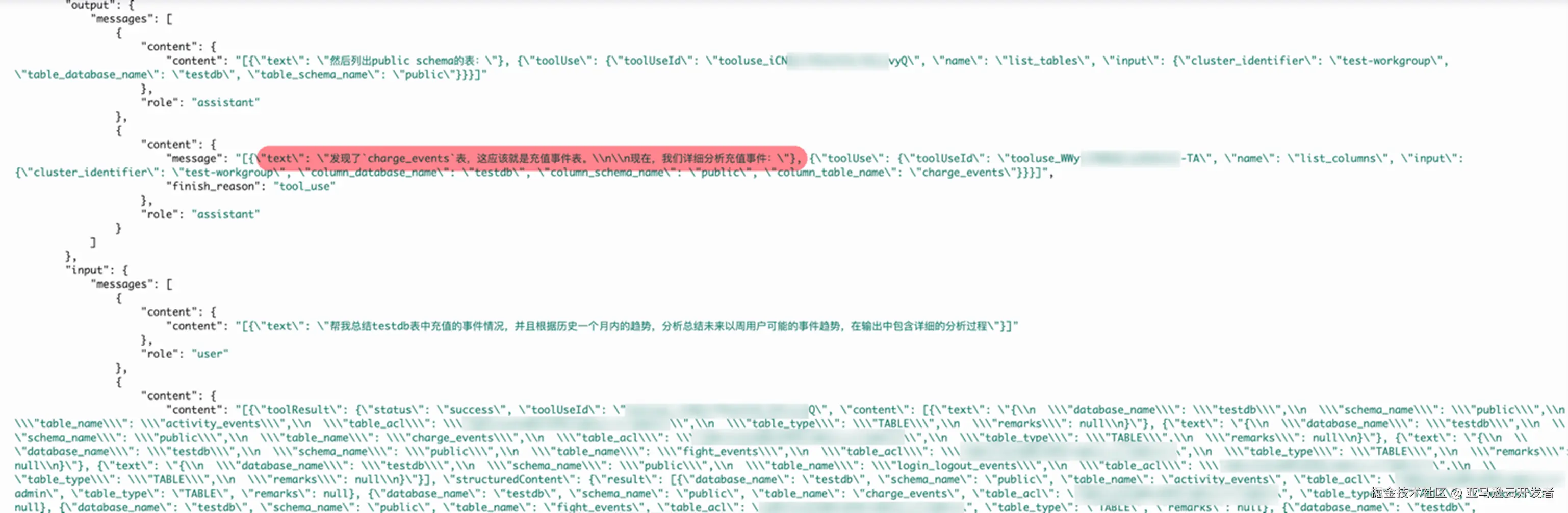上述测试方式中显式声明了具体需要查询数据库的名称,这是因为数据库名称为testdb,定义不明确,建议在生产环境中使用与业务紧密相关的数据库/表名称,或通过注释声明,或在系统提示词中添加定义以减少工具调用次数并且提高准确率。同时,我们在提示词中没有声明具体需要查询的表,因为表名称定义清晰,在下面的日志内容分析中可以更加清楚的看到Redshift MCP Server的工具调用过程中,AI可以明确的找到所需要的charge_events表。