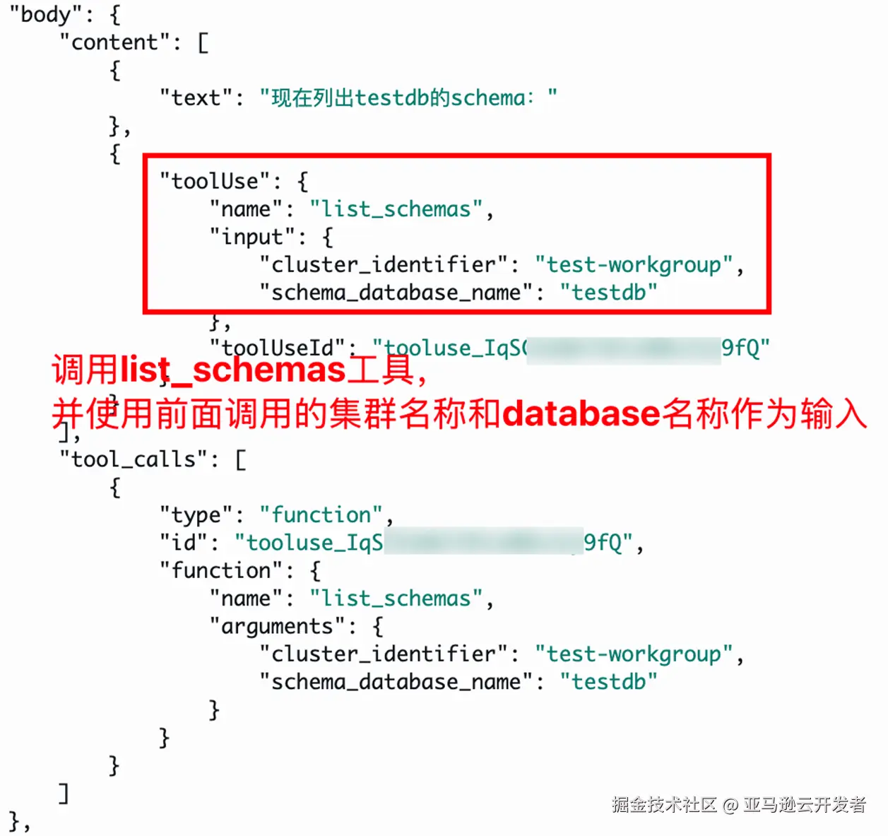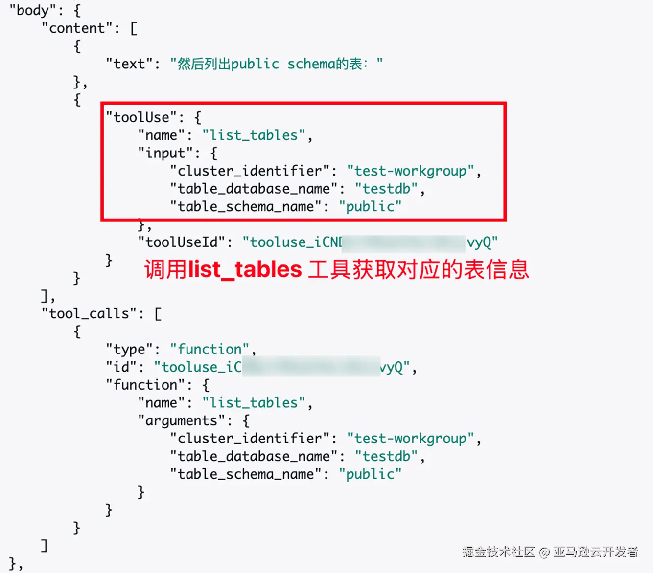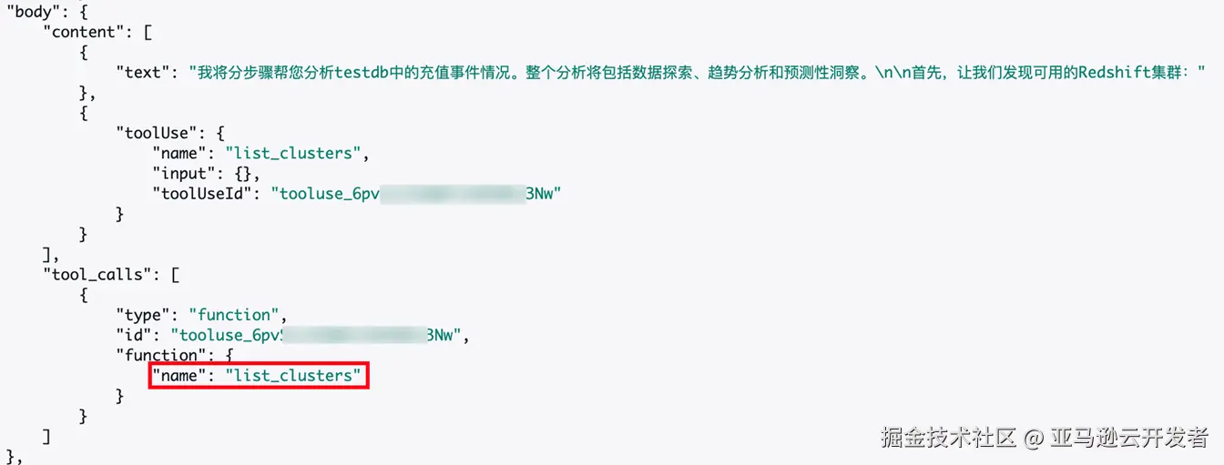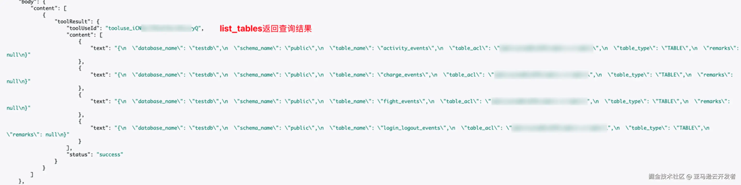 上述测试方式中显式声明了具体需要查询数据库的名称,这是因为数据库名称为testdb,定义不明确,建议在生产环境中使用与业务紧密相关的数据库/表名称,或通过注释声明,或在系统提示词中添加定义以减少工具调用次数并且提高准确率。同时,我们在提示词中没有声明具体需要查询的表,因为表名称定义清晰,在下面的日志内容分析中可以更加清楚的看到Redshift MCP Server的工具调用过程中,AI可以明确的找到所需要的charge_events表。