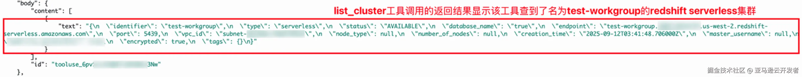 - 发现集群:(主要使用list_clusters工具)自动扫描亚马逊云科技账户中所有可用的Redshift集群和Serverless工作组,获取连接信息、状态和配置详情,为后续操作建立连接基础。