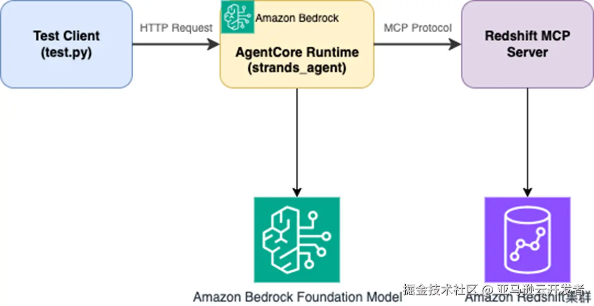 关于MCP的定义这里不再赘述。本文主要使用Amazon Redshift MCP Server来与Redshift资源进行交互。该MCP Server提供了一套全面的工具集,包括发现、探索和查询Amazon Redshift集群及无服务器工作组的功能,使AI助手能够安全高效地操作Redshift资源。该MCP Server使用Redshift Data API完成数仓的访问和操作,无需用户名密码。因此,在后续的AgentCore Runtime部署过程中,请确保AgentCore Runtime附加的角色有足够的权限访问Redshift中的数据,同时请注意分配对应的表权限。