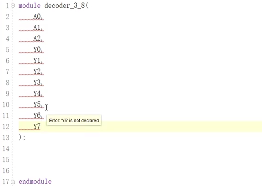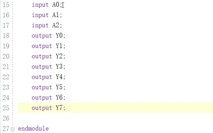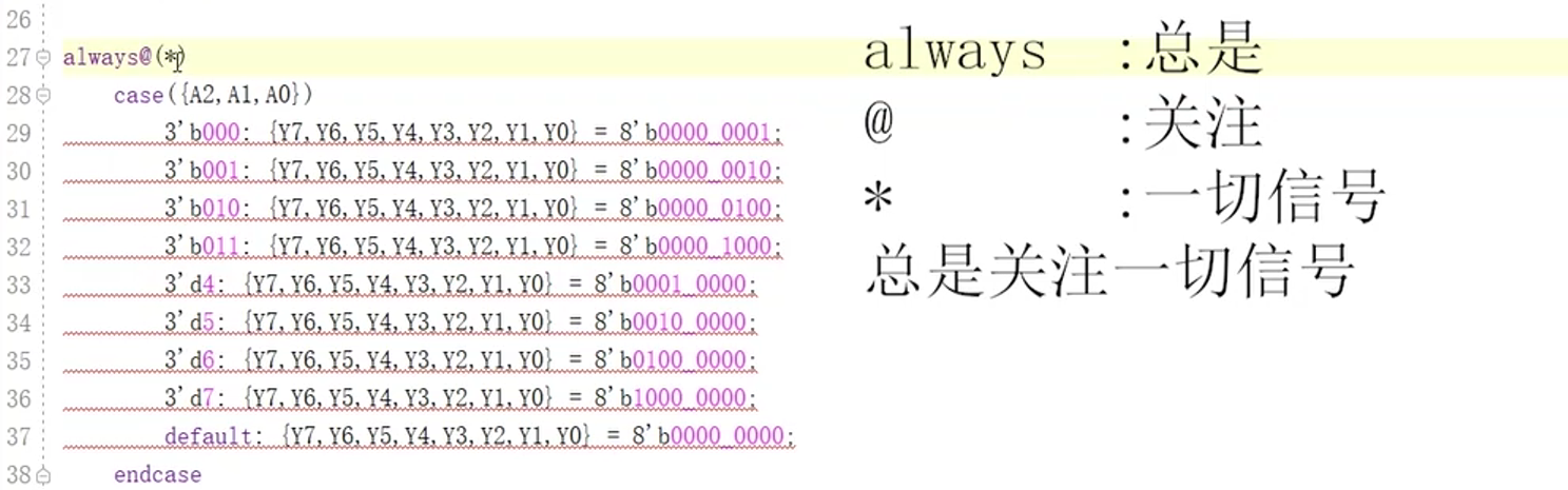 注意:在真值表中的输出端口是经过取非的,而刚才定义的八个输出信号没有经过取反,所以这里写的代码与真值表的三八译码器芯片输出的电平是相反的