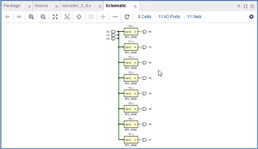 可以看到所生成的三八译码器不像二选一多路器能够看到一个典型的二选一多路器的数字逻辑模型,这是因为二选一多路器属于数字逻辑电路中的基本单元,而三八译码器更为复杂,软件本身是没有三八译码器模型的,所以只能将三八译码器分解后再进行显示。