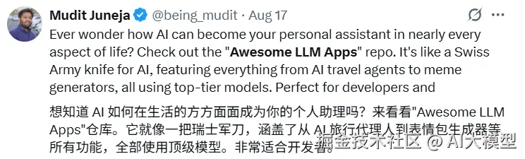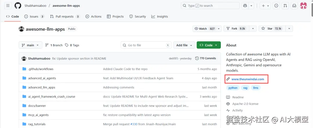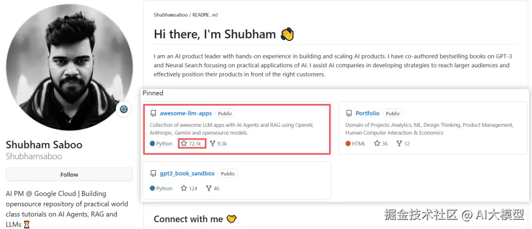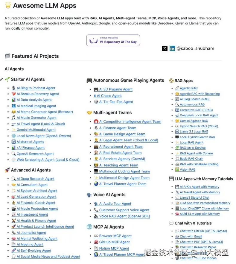 你是否有过这样的困扰:满怀热情想开发一款AI应用,却发现自己的技能止步于"调API"?今天为大家推荐一个GitHub开源项目 awesome-llm-apps,一个AI应用大全 ,由谷歌云高级AI产品经理Shubham Saboo创建并维护。目前项目已斩获72k Star,发布以来多次登上GitHub热门榜单。