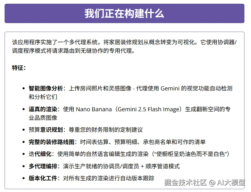 比如这里选择一个基于Nano Banana构建的AI家居装修规划智能体,在可视化网站上对该应用进行了详细介绍,包括用途、用到的技术栈、工作原理等。