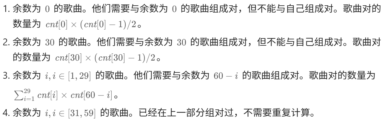 每首歌曲对结果的影响因素是它的持续时间除以 60 后的余数。可以用一个长度为 60 的数组 cnt,用来表示余数出现的次数。然后分情况统计歌曲对: