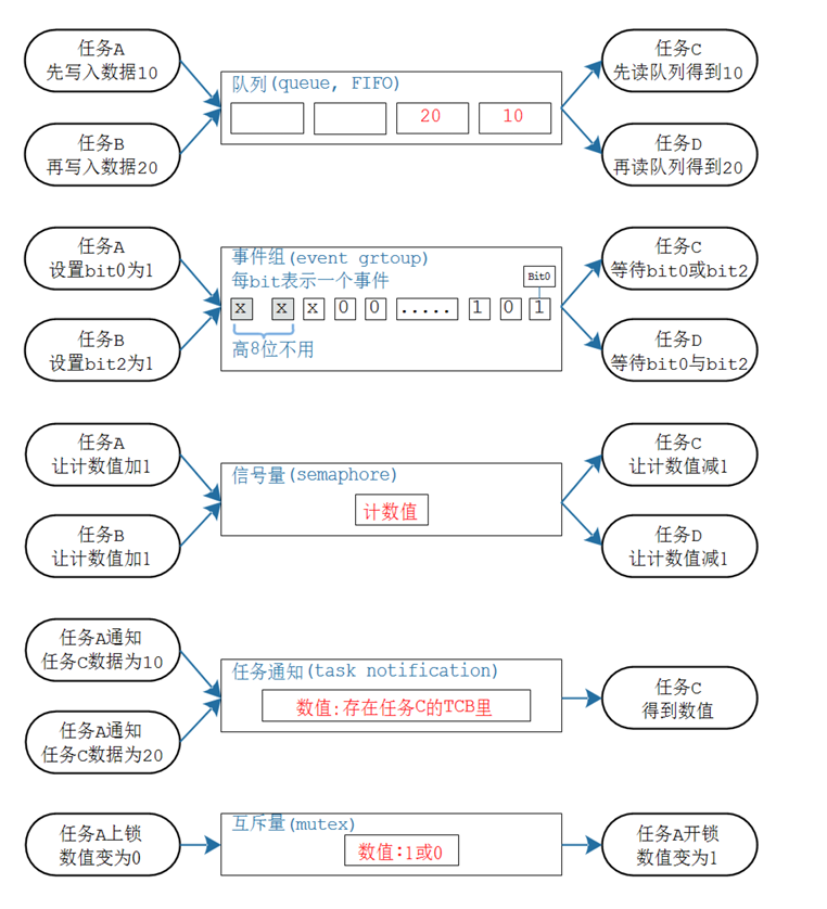 用到实际,如果通过串口发送数据,发到一半的过程中被打断了,过了一段时间再恢复,是不是通讯数据的错乱了,并且接受的串口数据的没法保证完整性。所以,要在部分情况下加个锁,此时就用到了互斥。如果发送是数据还没准备好,是不是发送指令要等待发送数据,这就是同步。