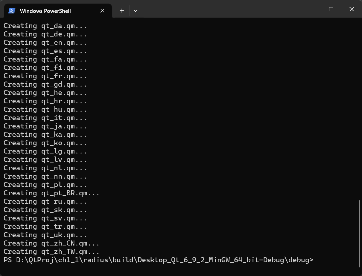 PS D:\QtProj\ch1_1\radius\build\Desktop_Qt_6_9_2_MinGW_64_bit-Debug\debug> windeployqt radius.exe