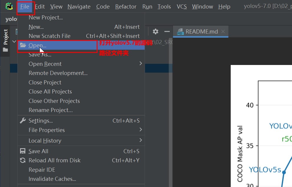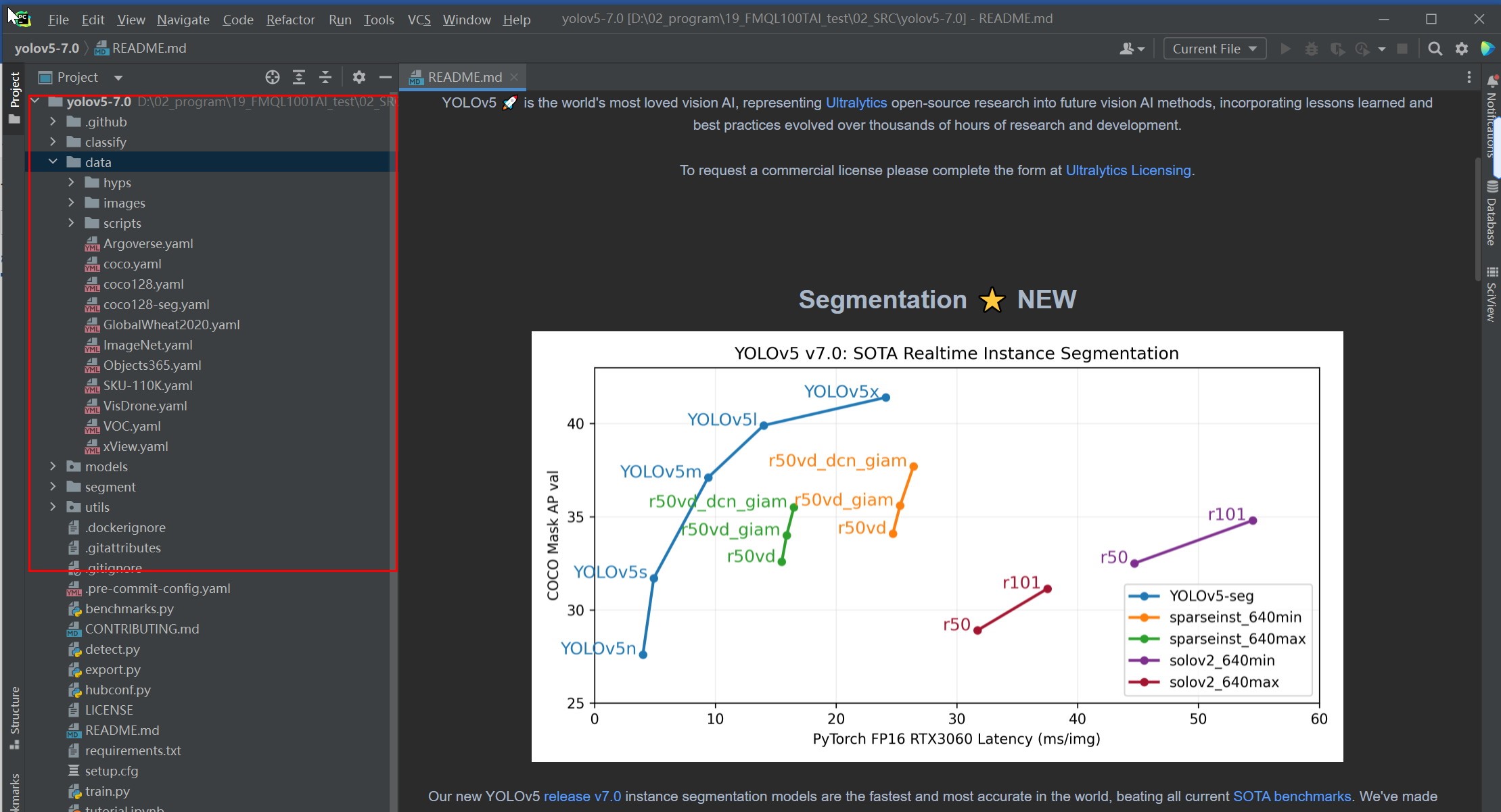 1、使用pycharm打开yolov5.7的解压目录文件,如下所示: