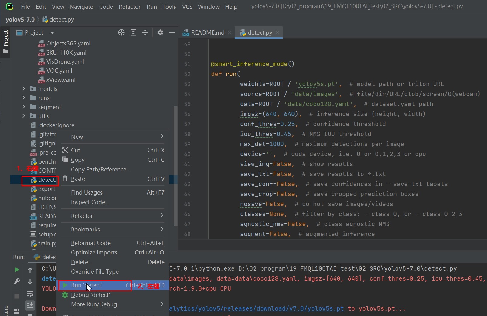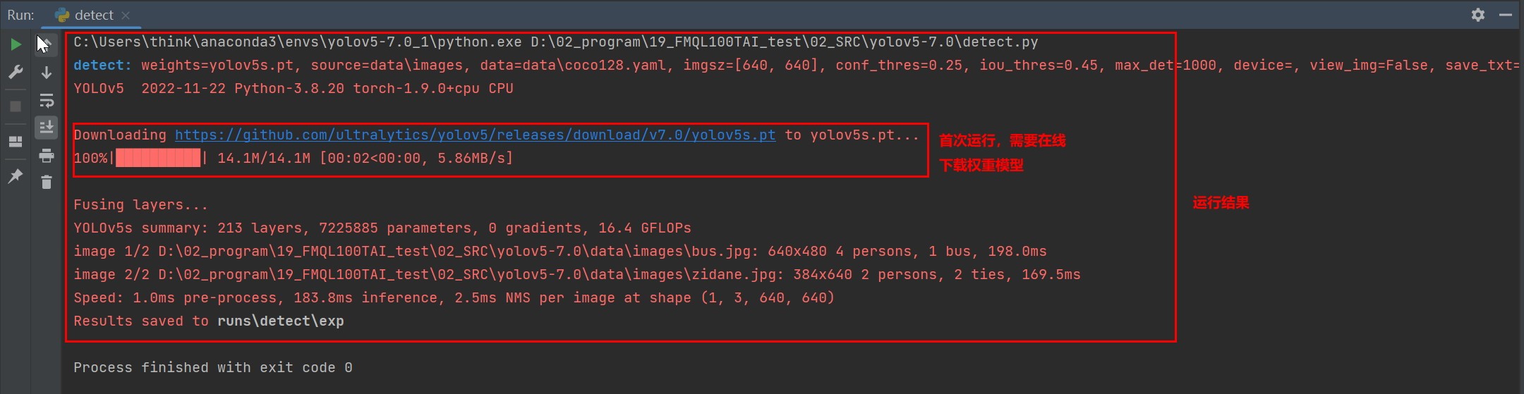 1、打开yolov5.7.0工程目录下的detect.py文件,运行该python文件(注意:首次运行,需要计算机连接互联网,下载yolov5s.pt的权重模型),如下图所示: