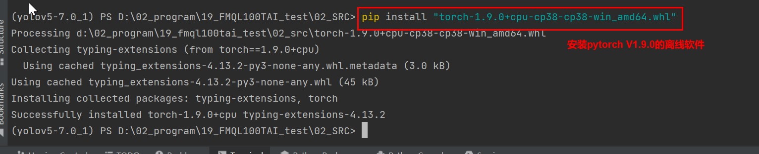 4、进入pycharm的终端,分别进行torch和torchvision离线安装包的安装,具体流程如下所述: