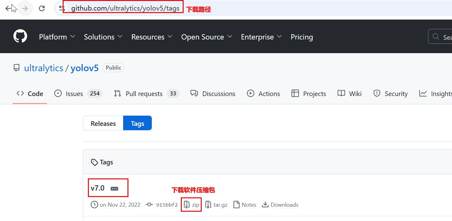 1、在yolov5的官方下载7.0的版本的yolov5的源码,如下所示: