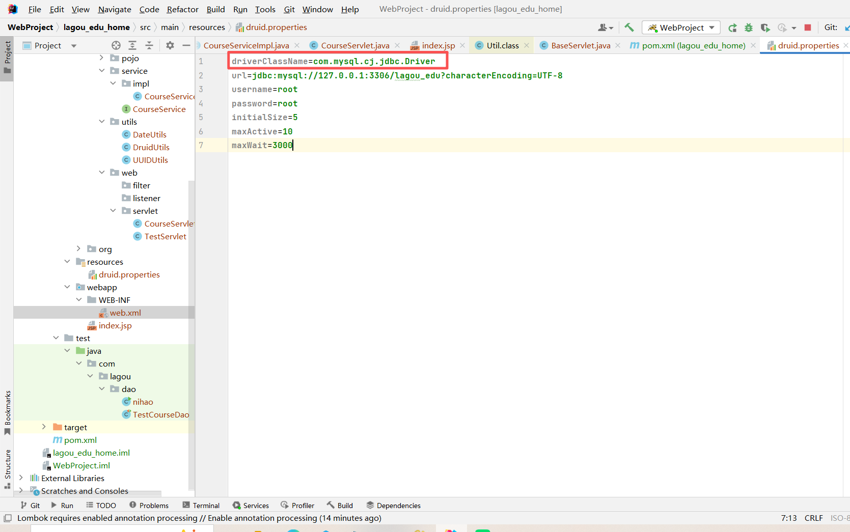 记得还要修改这个驱动的名称(这个druid.properties文件在项目中没有找到 我是在pom.xml中用快捷键ctrl+shift+t 然后输入mysql-connector-java 找到的这个文件 然后将驱动的名称改为下面的模样)