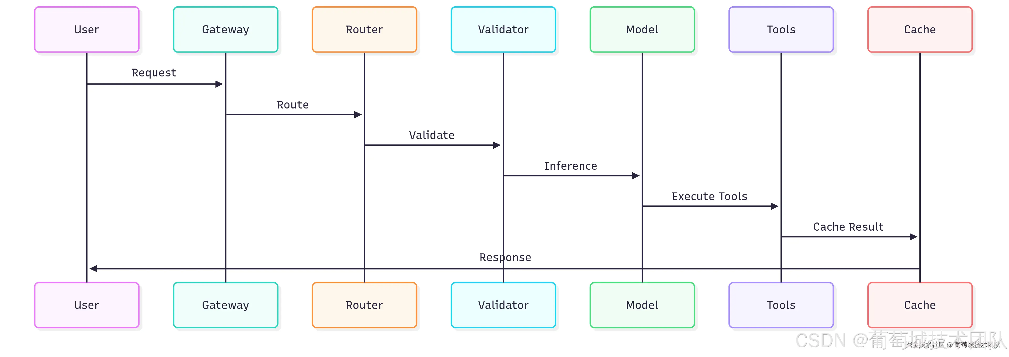 简化流程:用户 → 网关 → 路由器 → 验证器 → 模型 → 工具 → 缓存 → 响应 核心环节:请求路由、输入验证(基于 Pydantic 的 Schema 验证)、推理处理(GPU 加速)、工具执行(智能体专用)、响应缓存(Redis 提升性能)