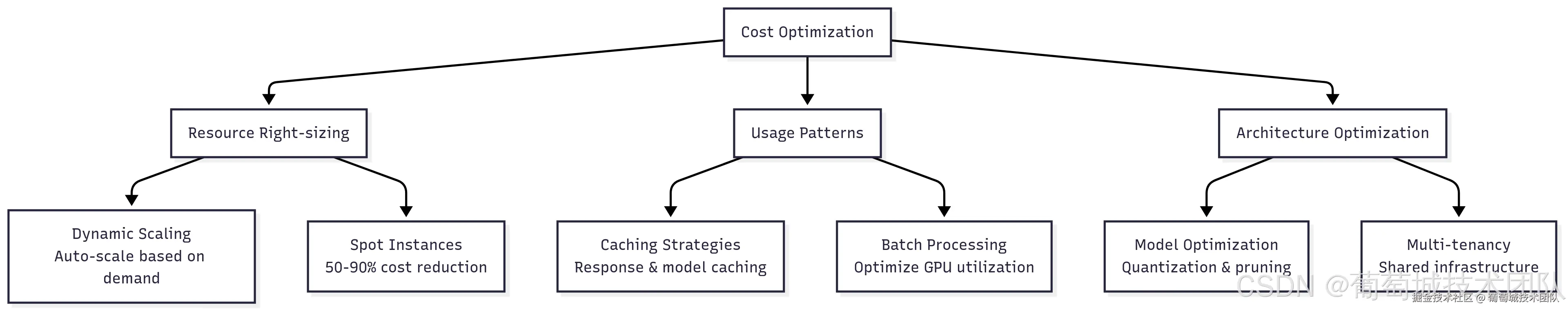 优化维度:资源合理配置、使用模式优化、架构优化 核心策略:动态扩缩容(基于需求自动伸缩)、抢占式实例(降低 50%-90%成本)、缓存策略(响应与模型缓存)、批处理(优化 GPU 利用率)、模型优化(量化与剪枝)、多租户(共享基础设施)