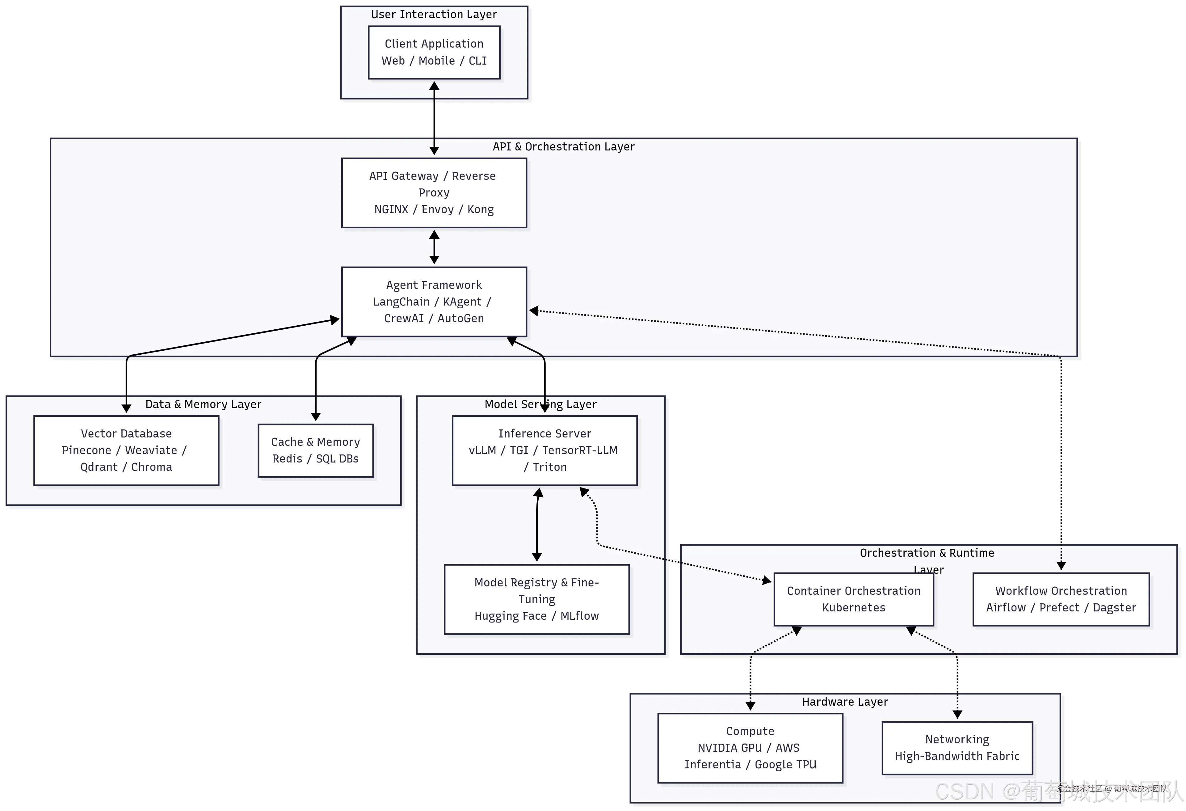 - 智能体框架(LangChain、KAgent、CrewAI、AutoGen):AI 业务逻辑核心,其中 KAgent 是专为高效编排设计的专用工具,支持 AI 任务的动态路由与工作流管理