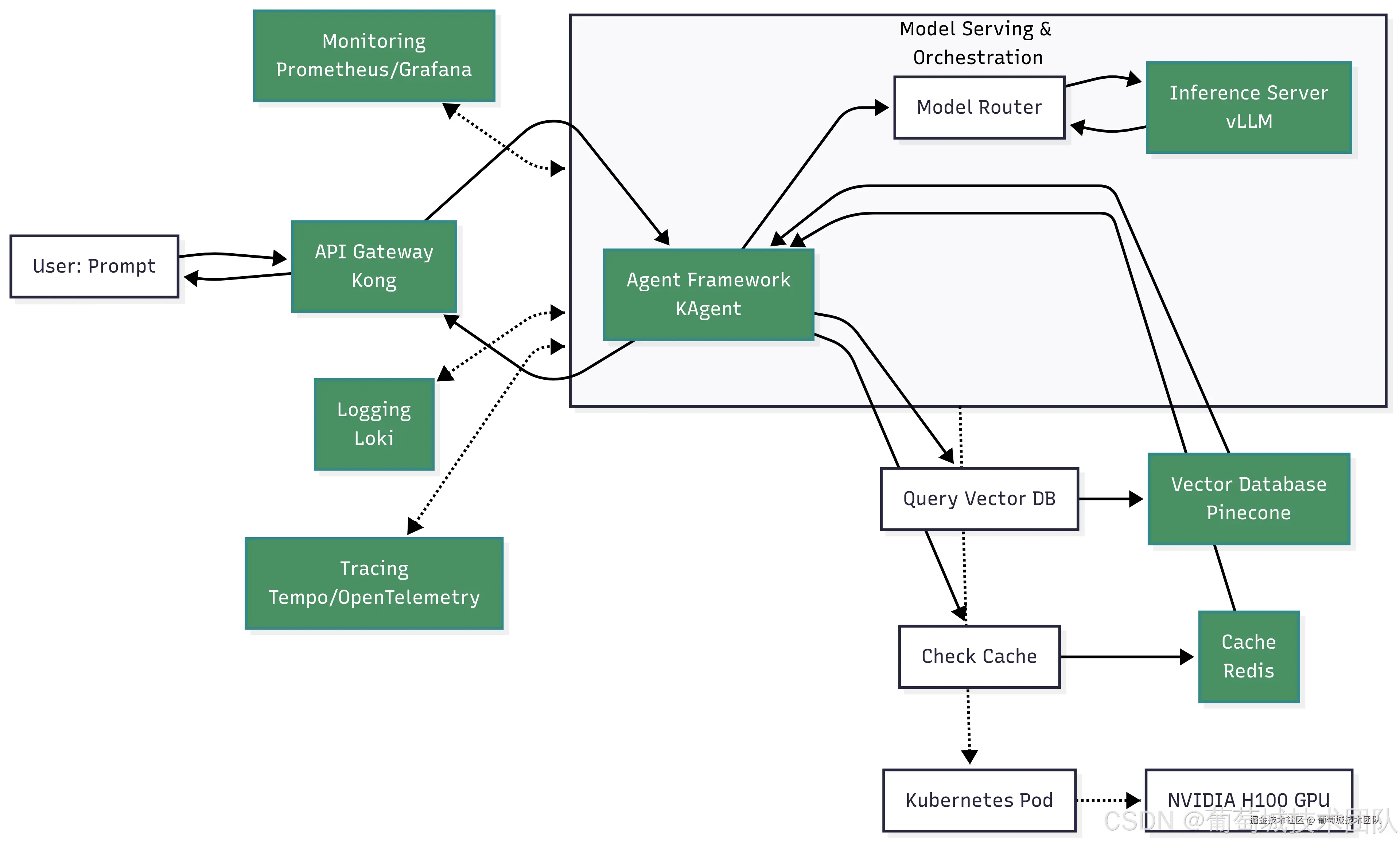 核心组件交互:用户提示 → API 网关(Kong)→ 智能体框架(KAgent)→ 模型路由器 → 推理服务器(vLLM)→ NVIDIA H100 GPU(Kubernetes Pod);配套组件:缓存(Redis)、向量数据库(Pinecone)、监控工具(Prometheus/Grafana)、日志工具(Loki)、链路追踪工具(Tempo/OpenTelemetry)