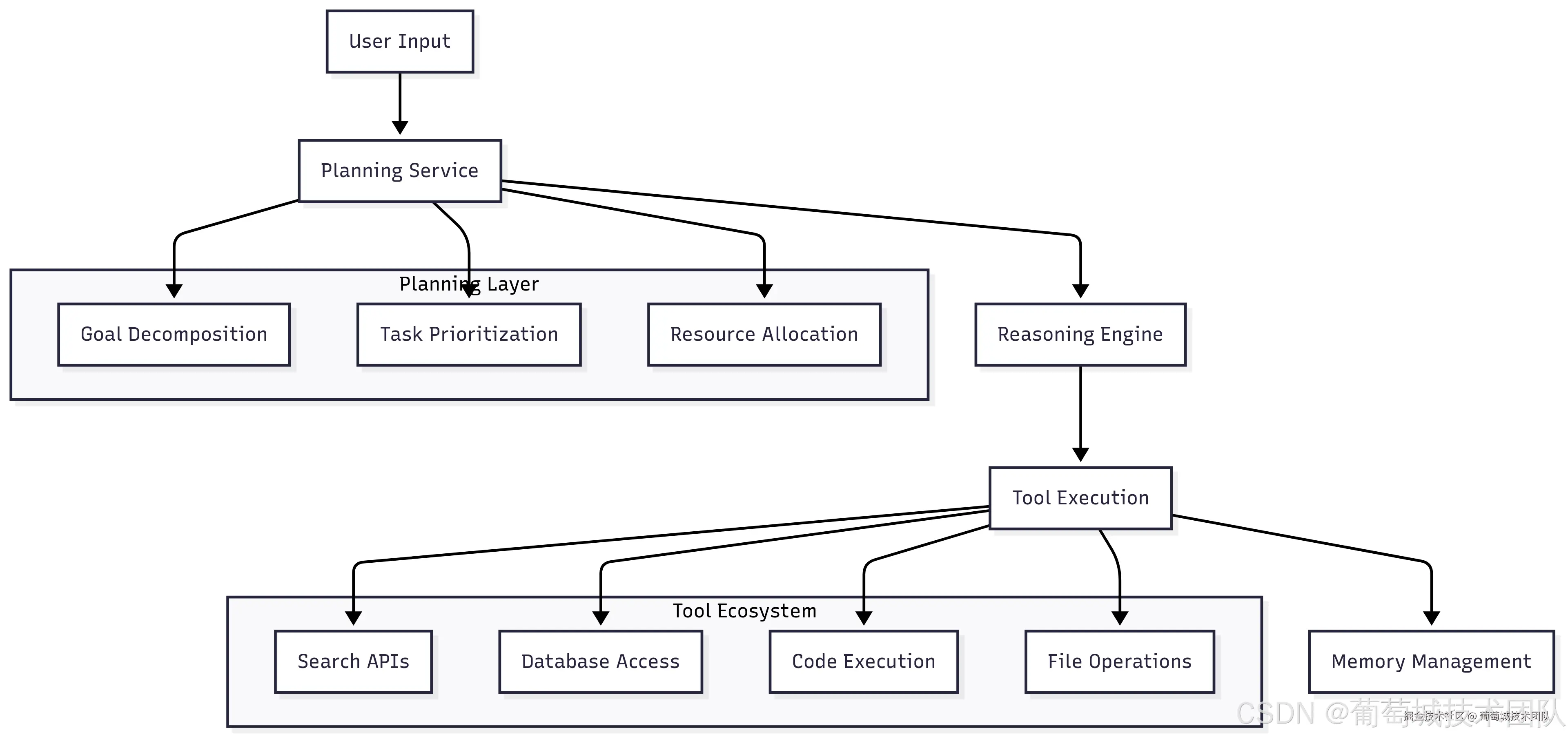 架构组成:用户输入 → 规划服务(规划层:目标分解、任务优先级排序、资源分配、推理引擎)→ 工具执行(工具生态:搜索 API、数据库访问、代码执行、文件操作)→ 内存管理(工作内存、情景记忆、语义记忆)