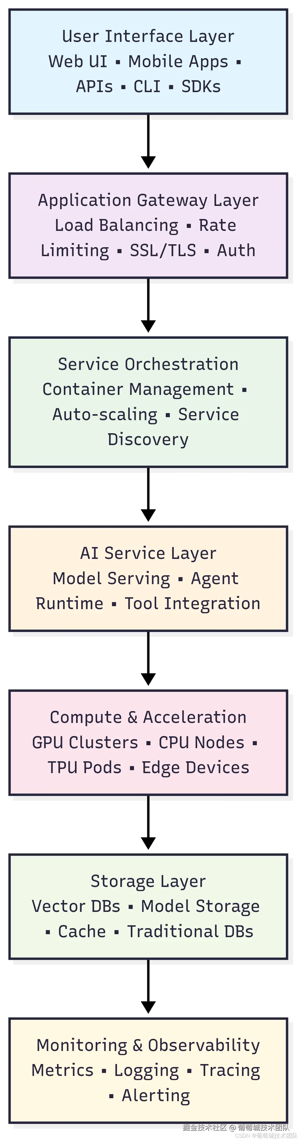 层级构成:用户交互层 → API 网关层 → 服务编排层 → AI 服务层 → 计算与加速层 → 存储层 → 监控与可观测性层 各层核心功能: