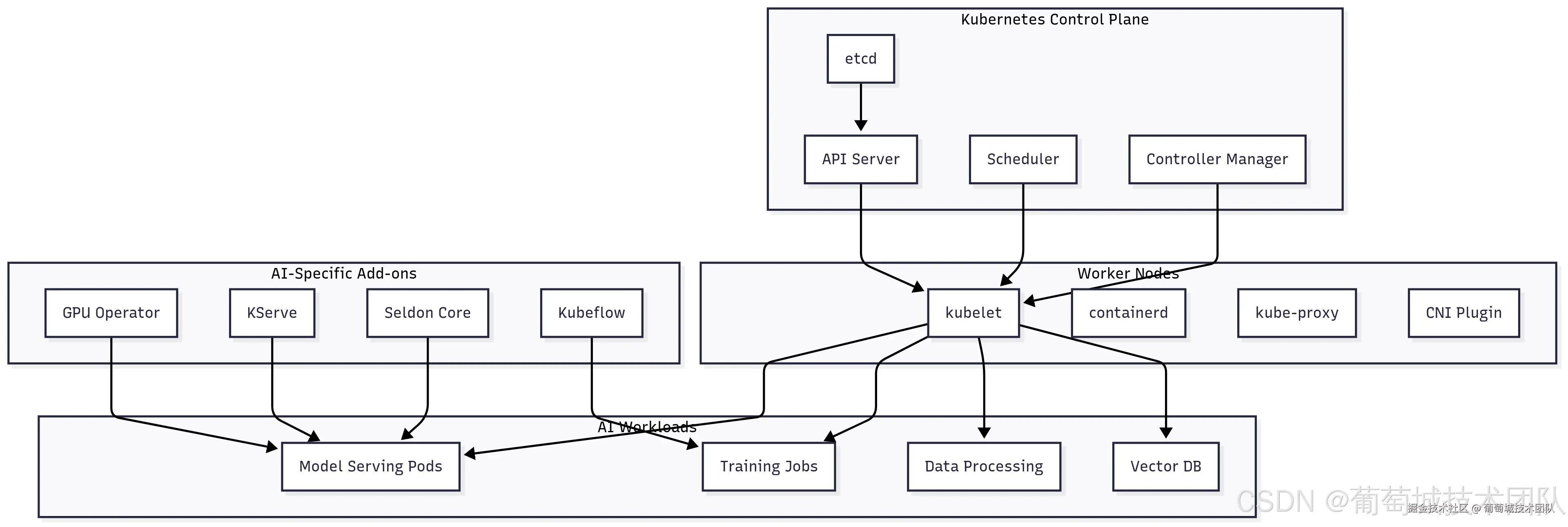 Kubernetes 控制平面组件:etcd、API 服务器、调度器、控制器管理器 AI 专属插件:GPU 操作员(GPU Operator)、KServe、Seldon Core、Kubeflow 工作节点组件:kubelet、containerd、kube-proxy、CNI 插件 AI 工作负载:模型服务 Pod、训练任务、数据处理、向量数据库