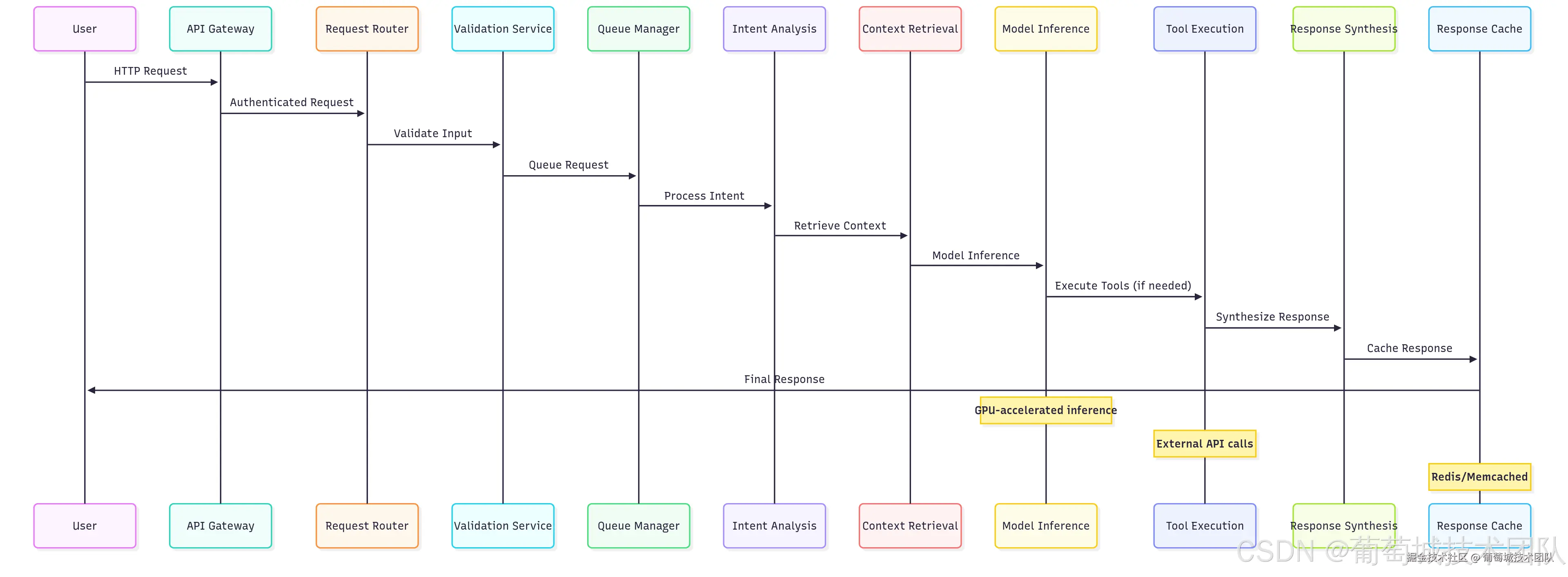 用户请求流程:API 网关 → 请求路由器 → 验证服务 → 队列管理器 → 意图分析 → 上下文检索 → 模型推理 → 工具执行(如需)→ 响应合成 → 响应缓存 → 最终响应 关键组件:GPU 加速推理、外部 API 调用、Redis / Memcached 缓存