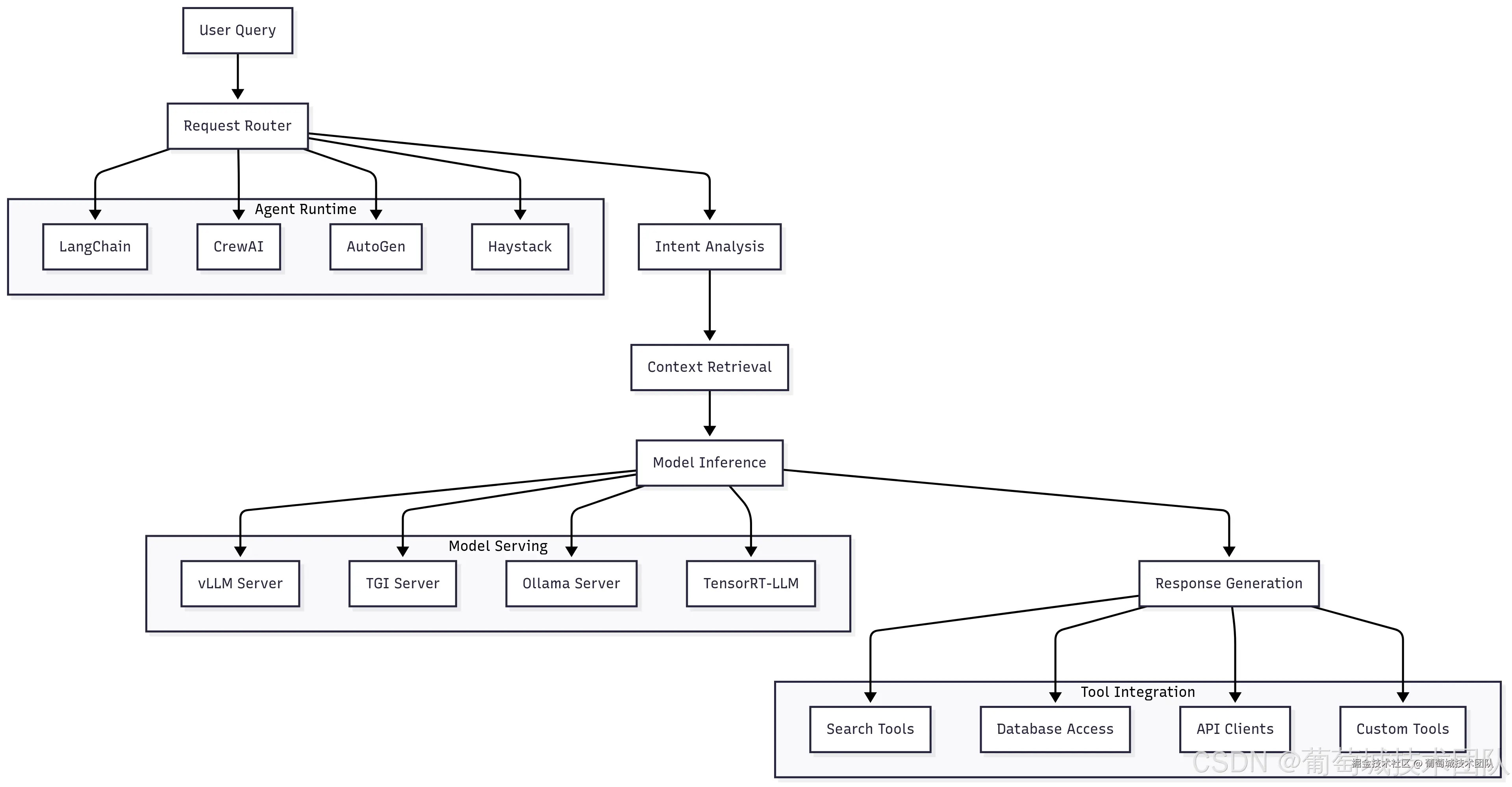 AI 服务层是 AI 基础设施的核心,承载着实际的智能能力。该层包含模型服务引擎、智能体编排系统及工具集成框架,支撑复杂 AI 工作流的运行。其架构直接影响 AI 应用的用户体验、系统性能及运维复杂度。