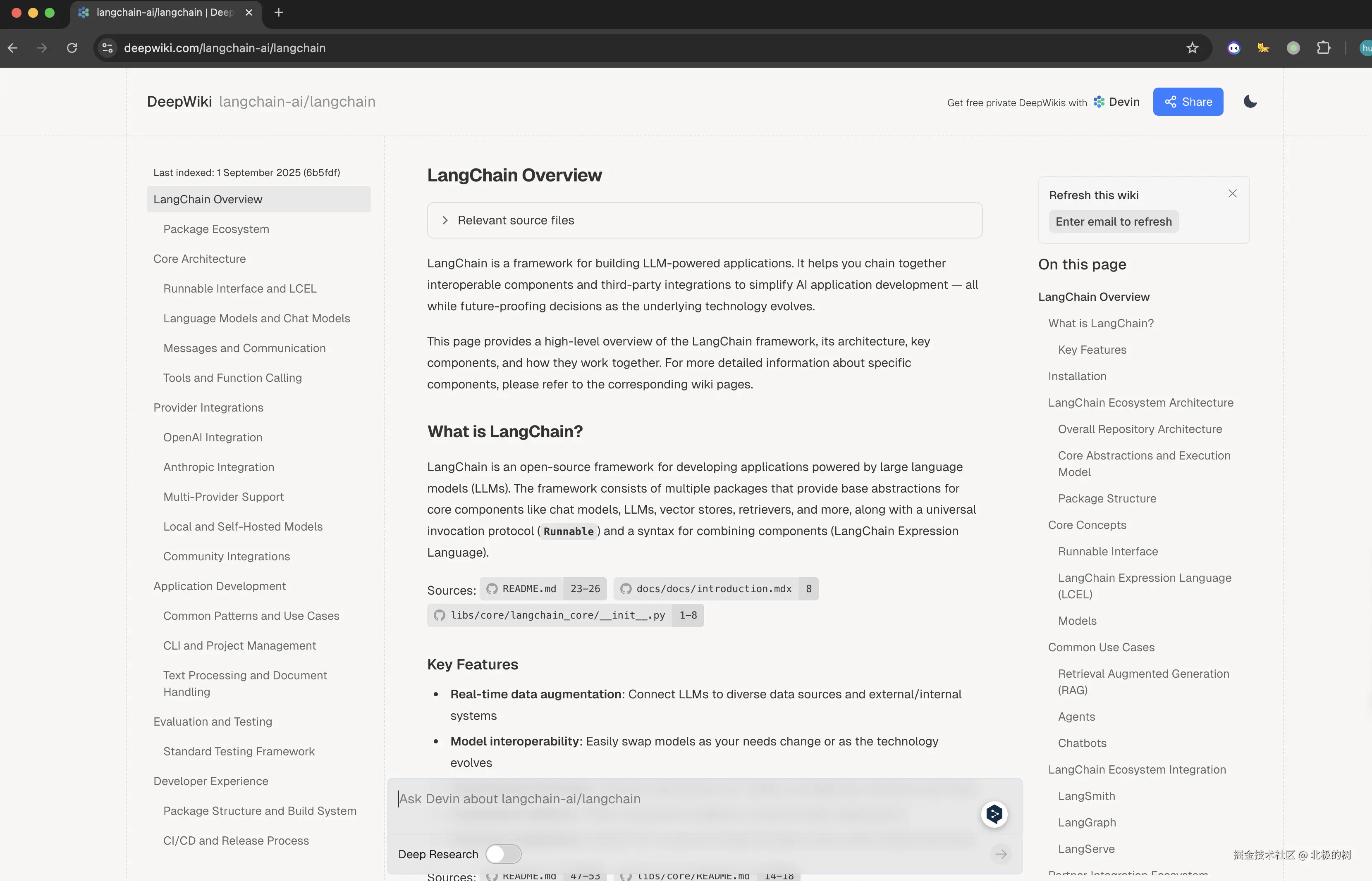 我个人觉得目前做得最好的是Devin.ai的DeepWiki。你只需要把Github仓库链接中的github改成deepwiki,就能看到它自动生成的详细项目知识库,效果挺不错。官方还提供了MCP Server支持知识库问答。