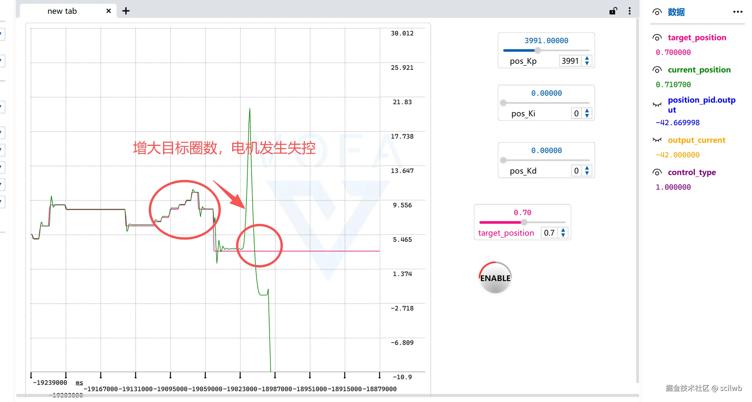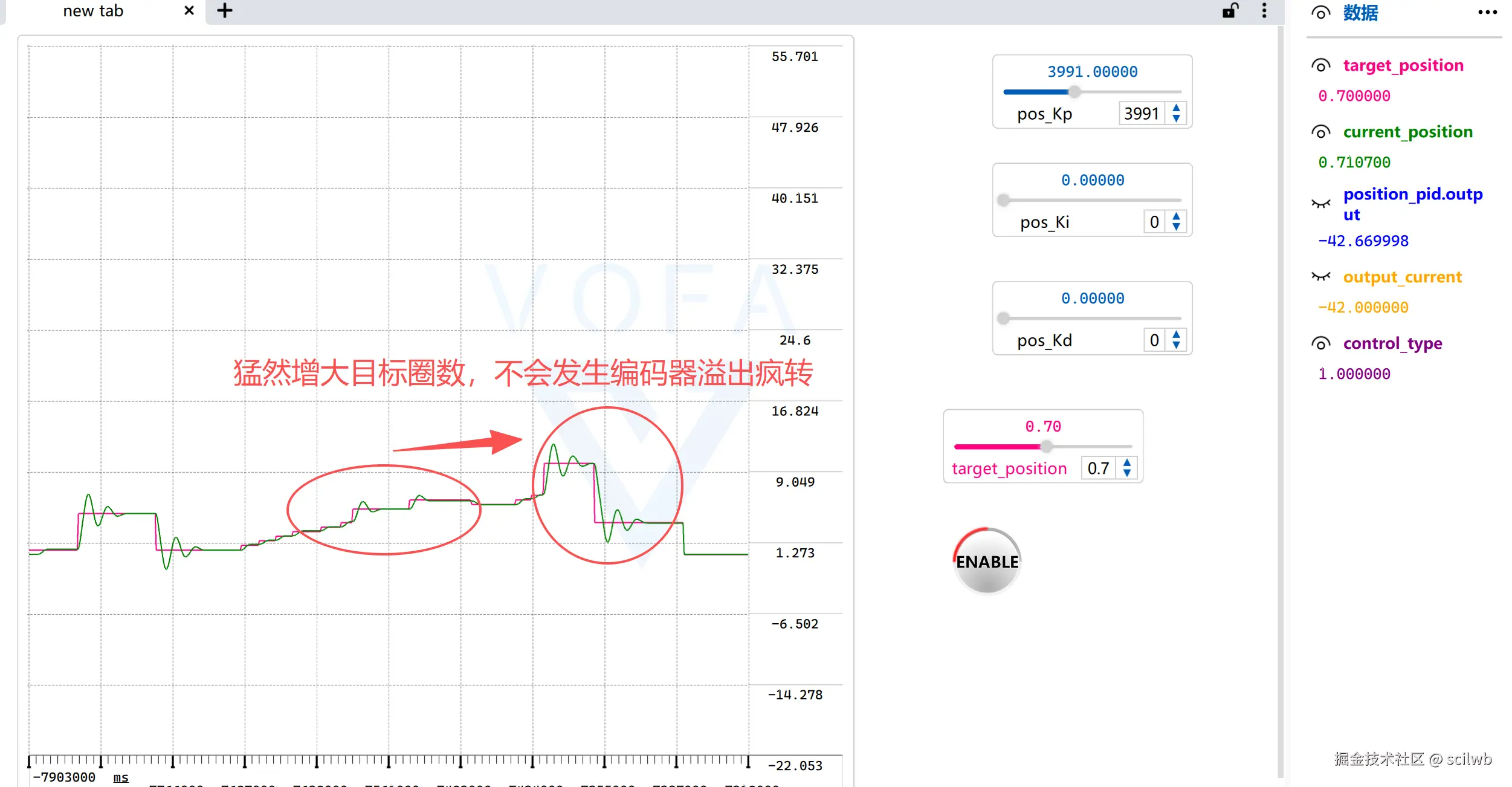 代码初步完成后,通过 VOFA+ 发送较小的目标圈数(比如 0.5 圈,1 圈)时,电机响应正常,能够比较稳定地到达目标位置。然而,当我尝试发送一个较大的目标圈数(比如 10 圈,20 圈)时,电机突然像"脱缰野马"一样开始疯狂高速旋转,完全失控!