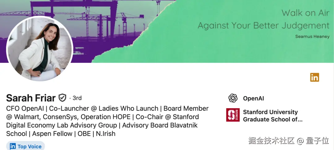 Sarah Friar 曾是高盛的股权研究分析师,在 Salesforce 和 Block 担任过高级财务职位,去年才从社交网络应用 Nextdoor 的 CEO 位置上跳槽到 OpenAI。